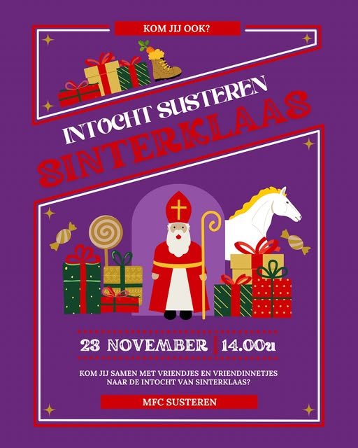 Staat 23 november al in je agenda? Want dan komt Sinterklaas weer naar Susteren! Kom jij ook samen met je vriendjes en vriendinnetjes naar het MFC Susteren om hem feestelijk te ontvangen?